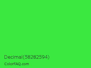 Decimal 58282594 Color is a normal green color and the nearest color is Lime Green #32cd32. Hex code #39e93e and RGB value is rgb(57,233,62). In RGB color space, this color is composed of 22% red, 91% green, 24% blue, In CMYK color space, this color is composed of 76% cyan, 0% magenta, 73% yellow , 9% black , In HSL color space, this color has a hue angle of 122° , 80% saturation and 57% lightness.