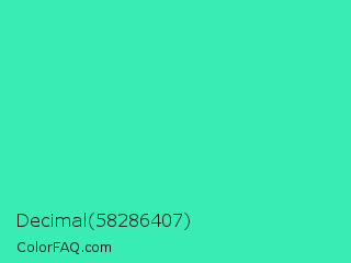 Decimal 58286407 Color is a normal green color and the nearest color is Eucalyptus #44d7a8. Hex code #39ecb3 and RGB value is rgb(57,236,179). In RGB color space, this color is composed of 22% red, 93% green, 70% blue, In CMYK color space, this color is composed of 76% cyan, 0% magenta, 24% yellow , 7% black , In HSL color space, this color has a hue angle of 161° , 82% saturation and 57% lightness.