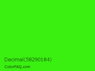 Decimal 58290184 Color is a normal green color and the nearest color is Neon Green #39ff14. Hex code #39f010 and RGB value is rgb(57,240,16). In RGB color space, this color is composed of 22% red, 94% green, 6% blue, In CMYK color space, this color is composed of 76% cyan, 0% magenta, 93% yellow , 6% black , In HSL color space, this color has a hue angle of 109° , 88% saturation and 50% lightness.