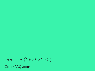 Decimal 58292530 Color is a normal green color and the nearest color is Eucalyptus #44d7a8. Hex code #39f3ac and RGB value is rgb(57,243,172). In RGB color space, this color is composed of 22% red, 95% green, 67% blue, In CMYK color space, this color is composed of 77% cyan, 0% magenta, 29% yellow , 5% black , In HSL color space, this color has a hue angle of 157° , 89% saturation and 59% lightness.
