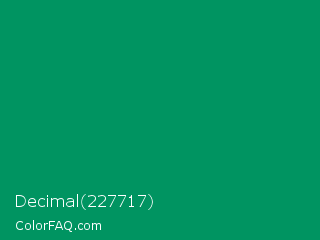 Decimal 227717 Color is a dark green color and the nearest color is Green Cyan #009966. Hex code #009461 and RGB value is rgb(0,148,97). In RGB color space, this color is composed of 0% red, 58% green, 38% blue, In CMYK color space, this color is composed of 100% cyan, 0% magenta, 34% yellow , 42% black , In HSL color space, this color has a hue angle of 159° , 100% saturation and 29% lightness.