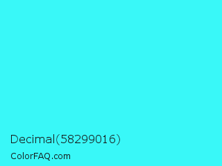 Decimal 58299016 Color is a normal cyan color and the nearest color is Loeen #15f2fd. Hex code #39f8f8 and RGB value is rgb(57,248,248). In RGB color space, this color is composed of 22% red, 97% green, 97% blue, In CMYK color space, this color is composed of 77% cyan, 0% magenta, 0% yellow , 3% black , In HSL color space, this color has a hue angle of 180° , 93% saturation and 60% lightness.