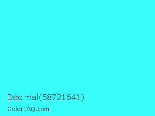 Decimal 58721641 Color is a light cyan color and the nearest color is Loeen #15f2fd. Hex code #39fdf9 and RGB value is rgb(57,253,249). In RGB color space, this color is composed of 22% red, 99% green, 98% blue, In CMYK color space, this color is composed of 77% cyan, 0% magenta, 2% yellow , 1% black , In HSL color space, this color has a hue angle of 179° , 98% saturation and 61% lightness.