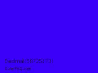 Decimal 58725173 Color is a normal indigo color and the nearest color is Electric Ultramarine #3f00ff. Hex code #3a00f7 and RGB value is rgb(58,0,247). In RGB color space, this color is composed of 23% red, 0% green, 97% blue, In CMYK color space, this color is composed of 77% cyan, 100% magenta, 0% yellow , 3% black , In HSL color space, this color has a hue angle of 254° , 100% saturation and 48% lightness.