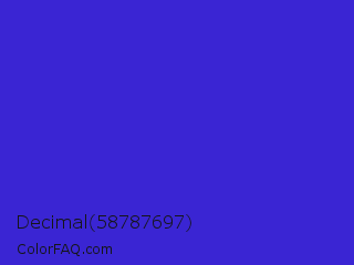Decimal 58787697 Color is a normal indigo color and the nearest color is Interdimensional Blue #360ccc. Hex code #3a25d3 and RGB value is rgb(58,37,211). In RGB color space, this color is composed of 23% red, 15% green, 83% blue, In CMYK color space, this color is composed of 73% cyan, 82% magenta, 0% yellow , 17% black , In HSL color space, this color has a hue angle of 247° , 70% saturation and 49% lightness.