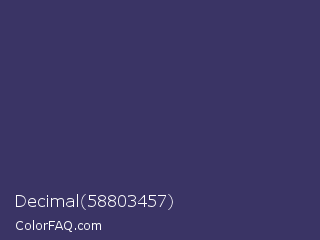 Decimal 58803457 Color is a dark indigo color and the nearest color is Deep Koamaru #333366. Hex code #3a3465 and RGB value is rgb(58,52,101). In RGB color space, this color is composed of 23% red, 20% green, 40% blue, In CMYK color space, this color is composed of 43% cyan, 49% magenta, 0% yellow , 60% black , In HSL color space, this color has a hue angle of 247° , 32% saturation and 30% lightness.