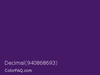 Decimal 940868693 Color is a dark purple color and the nearest color is Scarlet Gum #431560. Hex code #461967 and RGB value is rgb(70,25,103). In RGB color space, this color is composed of 27% red, 10% green, 40% blue, In CMYK color space, this color is composed of 32% cyan, 76% magenta, 0% yellow , 60% black , In HSL color space, this color has a hue angle of 275° , 61% saturation and 25% lightness.