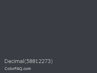 Decimal 58812273 Color is a dark blue color and the nearest color is Ship Gray #3e3a44. Hex code #3a3d43 and RGB value is rgb(58,61,67). In RGB color space, this color is composed of 23% red, 24% green, 26% blue, In CMYK color space, this color is composed of 13% cyan, 9% magenta, 0% yellow , 74% black , In HSL color space, this color has a hue angle of 220° , 7% saturation and 25% lightness.