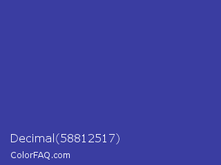 Decimal 58812517 Color is a normal blue color and the nearest color is Blue Pigment #333399. Hex code #3a3da1 and RGB value is rgb(58,61,161). In RGB color space, this color is composed of 23% red, 24% green, 63% blue, In CMYK color space, this color is composed of 64% cyan, 62% magenta, 0% yellow , 37% black , In HSL color space, this color has a hue angle of 238° , 47% saturation and 43% lightness.