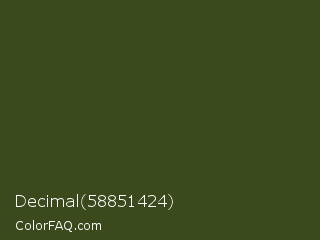 Decimal 58851424 Color is a very dark green color and the nearest color is Clover #384910. Hex code #3a4a1c and RGB value is rgb(58,74,28). In RGB color space, this color is composed of 23% red, 29% green, 11% blue, In CMYK color space, this color is composed of 22% cyan, 0% magenta, 62% yellow , 71% black , In HSL color space, this color has a hue angle of 81° , 45% saturation and 20% lightness.