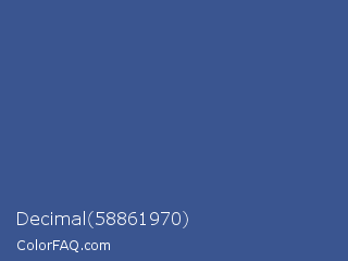 Decimal 58861970 Color is a normal blue color and the nearest color is Chambray #354e8c. Hex code #3a5590 and RGB value is rgb(58,85,144). In RGB color space, this color is composed of 23% red, 33% green, 56% blue, In CMYK color space, this color is composed of 60% cyan, 41% magenta, 0% yellow , 44% black , In HSL color space, this color has a hue angle of 221° , 43% saturation and 40% lightness.