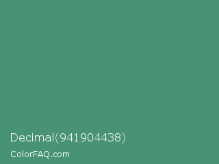 Decimal 941904438 Color is a normal green color and the nearest color is Viridian #40826d. Hex code #479374 and RGB value is rgb(71,147,116). In RGB color space, this color is composed of 28% red, 58% green, 45% blue, In CMYK color space, this color is composed of 52% cyan, 0% magenta, 21% yellow , 42% black , In HSL color space, this color has a hue angle of 156° , 35% saturation and 43% lightness.
