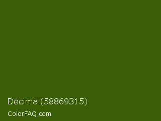 Decimal 58869315 Color is a very dark green color and the nearest color is Verdun Green #495400. Hex code #3a5c03 and RGB value is rgb(58,92,3). In RGB color space, this color is composed of 23% red, 36% green, 1% blue, In CMYK color space, this color is composed of 37% cyan, 0% magenta, 97% yellow , 64% black , In HSL color space, this color has a hue angle of 83° , 94% saturation and 19% lightness.