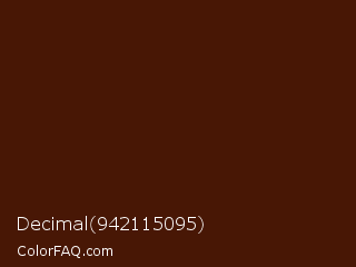 Decimal 942115095 Color is a very dark orange color and the nearest color is Van Cleef #49170c. Hex code #481705 and RGB value is rgb(72,23,5). In RGB color space, this color is composed of 28% red, 9% green, 2% blue, In CMYK color space, this color is composed of 0% cyan, 68% magenta, 93% yellow , 72% black , In HSL color space, this color has a hue angle of 16° , 87% saturation and 15% lightness.