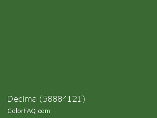 Decimal 58884121 Color is a normal green color and the nearest color is Mughal Green #306030. Hex code #3a6933 and RGB value is rgb(58,105,51). In RGB color space, this color is composed of 23% red, 41% green, 20% blue, In CMYK color space, this color is composed of 45% cyan, 0% magenta, 51% yellow , 59% black , In HSL color space, this color has a hue angle of 112° , 35% saturation and 31% lightness.