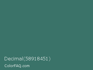 Decimal 58918451 Color is a normal cyan color and the nearest color is William #3a686c. Hex code #3a7369 and RGB value is rgb(58,115,105). In RGB color space, this color is composed of 23% red, 45% green, 41% blue, In CMYK color space, this color is composed of 50% cyan, 0% magenta, 9% yellow , 55% black , In HSL color space, this color has a hue angle of 169° , 33% saturation and 34% lightness.