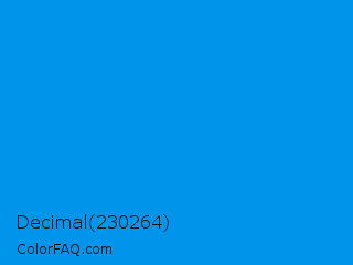 Decimal 230264 Color is a normal blue color and the nearest color is Vivid Cerulean #00aaee. Hex code #0095ea and RGB value is rgb(0,149,234). In RGB color space, this color is composed of 0% red, 58% green, 92% blue, In CMYK color space, this color is composed of 100% cyan, 36% magenta, 0% yellow , 8% black , In HSL color space, this color has a hue angle of 202° , 100% saturation and 46% lightness.