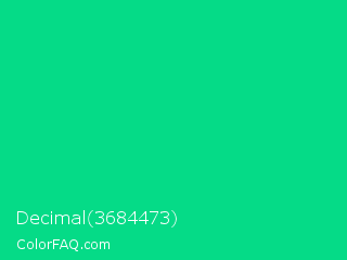 Decimal 3684473 Color is a normal green color and the nearest color is Caribbean Green #00cc99. Hex code #05db87 and RGB value is rgb(5,219,135). In RGB color space, this color is composed of 2% red, 86% green, 53% blue, In CMYK color space, this color is composed of 98% cyan, 0% magenta, 38% yellow , 14% black , In HSL color space, this color has a hue angle of 156° , 96% saturation and 44% lightness.