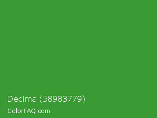Decimal 58983779 Color is a normal green color and the nearest color is May Green #4c9141. Hex code #3a9a33 and RGB value is rgb(58,154,51). In RGB color space, this color is composed of 23% red, 60% green, 20% blue, In CMYK color space, this color is composed of 62% cyan, 0% magenta, 67% yellow , 40% black , In HSL color space, this color has a hue angle of 116° , 50% saturation and 40% lightness.