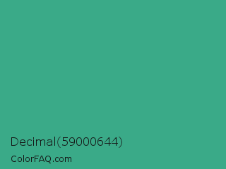 Decimal 59000644 Color is a normal green color and the nearest color is Zomp #39a78e. Hex code #3aaa88 and RGB value is rgb(58,170,136). In RGB color space, this color is composed of 23% red, 67% green, 53% blue, In CMYK color space, this color is composed of 66% cyan, 0% magenta, 20% yellow , 33% black , In HSL color space, this color has a hue angle of 162° , 49% saturation and 45% lightness.