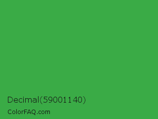 Decimal 59001140 Color is a normal green color and the nearest color is Wageningen Green #34b233. Hex code #3aab46 and RGB value is rgb(58,171,70). In RGB color space, this color is composed of 23% red, 67% green, 27% blue, In CMYK color space, this color is composed of 66% cyan, 0% magenta, 59% yellow , 33% black , In HSL color space, this color has a hue angle of 126° , 49% saturation and 45% lightness.