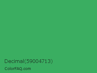 Decimal 59004713 Color is a normal green color and the nearest color is Chateau Green #40a860. Hex code #3aae61 and RGB value is rgb(58,174,97). In RGB color space, this color is composed of 23% red, 68% green, 38% blue, In CMYK color space, this color is composed of 67% cyan, 0% magenta, 44% yellow , 32% black , In HSL color space, this color has a hue angle of 140° , 50% saturation and 45% lightness.