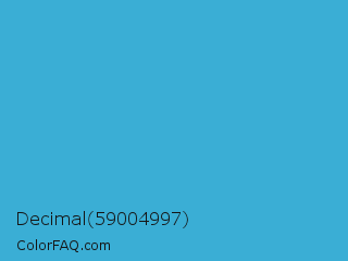 Decimal 59004997 Color is a normal blue color and the nearest color is Maximum Blue #47abcc. Hex code #3aaed5 and RGB value is rgb(58,174,213). In RGB color space, this color is composed of 23% red, 68% green, 84% blue, In CMYK color space, this color is composed of 73% cyan, 18% magenta, 0% yellow , 16% black , In HSL color space, this color has a hue angle of 195° , 65% saturation and 53% lightness.