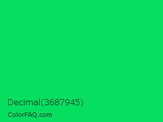 Decimal 3687945 Color is a normal green color and the nearest color is Malachite #0bda51. Hex code #05de61 and RGB value is rgb(5,222,97). In RGB color space, this color is composed of 2% red, 87% green, 38% blue, In CMYK color space, this color is composed of 98% cyan, 0% magenta, 56% yellow , 13% black , In HSL color space, this color has a hue angle of 145° , 96% saturation and 45% lightness.