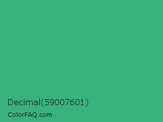 Decimal 59007601 Color is a normal green color and the nearest color is Mint #3eb489. Hex code #3ab07f and RGB value is rgb(58,176,127). In RGB color space, this color is composed of 23% red, 69% green, 50% blue, In CMYK color space, this color is composed of 67% cyan, 0% magenta, 28% yellow , 31% black , In HSL color space, this color has a hue angle of 155° , 50% saturation and 46% lightness.