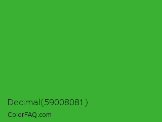 Decimal 59008081 Color is a normal green color and the nearest color is Wageningen Green #34b233. Hex code #3ab133 and RGB value is rgb(58,177,51). In RGB color space, this color is composed of 23% red, 69% green, 20% blue, In CMYK color space, this color is composed of 67% cyan, 0% magenta, 71% yellow , 31% black , In HSL color space, this color has a hue angle of 117° , 55% saturation and 45% lightness.