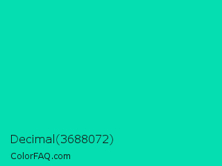 Decimal 3688072 Color is a normal cyan color and the nearest color is Amazonite #00c4b0. Hex code #05deb0 and RGB value is rgb(5,222,176). In RGB color space, this color is composed of 2% red, 87% green, 69% blue, In CMYK color space, this color is composed of 98% cyan, 0% magenta, 21% yellow , 13% black , In HSL color space, this color has a hue angle of 167° , 96% saturation and 45% lightness.