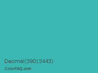 Decimal 59015443 Color is a normal cyan color and the nearest color is Verdigris #43b3ae. Hex code #3ab7b1 and RGB value is rgb(58,183,177). In RGB color space, this color is composed of 23% red, 72% green, 69% blue, In CMYK color space, this color is composed of 68% cyan, 0% magenta, 3% yellow , 28% black , In HSL color space, this color has a hue angle of 177° , 52% saturation and 47% lightness.