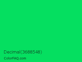 Decimal 3688548 Color is a normal green color and the nearest color is Malachite #0bda51. Hex code #05df60 and RGB value is rgb(5,223,96). In RGB color space, this color is composed of 2% red, 87% green, 38% blue, In CMYK color space, this color is composed of 98% cyan, 0% magenta, 57% yellow , 13% black , In HSL color space, this color has a hue angle of 145° , 96% saturation and 45% lightness.
