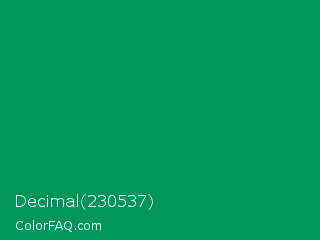 Decimal 230537 Color is a dark green color and the nearest color is Spanish Green #009150. Hex code #009659 and RGB value is rgb(0,150,89). In RGB color space, this color is composed of 0% red, 59% green, 35% blue, In CMYK color space, this color is composed of 100% cyan, 0% magenta, 41% yellow , 41% black , In HSL color space, this color has a hue angle of 156° , 100% saturation and 29% lightness.