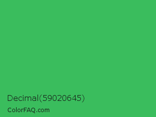 Decimal 59020645 Color is a normal green color and the nearest color is Chateau Green #40a860. Hex code #3abd5d and RGB value is rgb(58,189,93). In RGB color space, this color is composed of 23% red, 74% green, 36% blue, In CMYK color space, this color is composed of 69% cyan, 0% magenta, 51% yellow , 26% black , In HSL color space, this color has a hue angle of 136° , 53% saturation and 48% lightness.