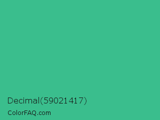 Decimal 59021417 Color is a normal green color and the nearest color is Mountain Meadow #30ba8f. Hex code #3abe8d and RGB value is rgb(58,190,141). In RGB color space, this color is composed of 23% red, 75% green, 55% blue, In CMYK color space, this color is composed of 69% cyan, 0% magenta, 26% yellow , 25% black , In HSL color space, this color has a hue angle of 158° , 53% saturation and 49% lightness.
