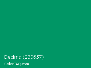 Decimal 230657 Color is a dark green color and the nearest color is Green Cyan #009966. Hex code #009665 and RGB value is rgb(0,150,101). In RGB color space, this color is composed of 0% red, 59% green, 40% blue, In CMYK color space, this color is composed of 100% cyan, 0% magenta, 33% yellow , 41% black , In HSL color space, this color has a hue angle of 160° , 100% saturation and 29% lightness.