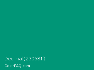 Decimal 230681 Color is a dark cyan color and the nearest color is Paolo Veronese Green #009b7d. Hex code #009677 and RGB value is rgb(0,150,119). In RGB color space, this color is composed of 0% red, 59% green, 47% blue, In CMYK color space, this color is composed of 100% cyan, 0% magenta, 21% yellow , 41% black , In HSL color space, this color has a hue angle of 168° , 100% saturation and 29% lightness.