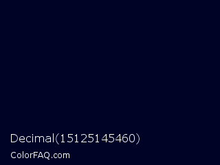 Decimal 15125145460 Color is a almost black blue color and the nearest color is Black Russian #0a001c. Hex code #000326 and RGB value is rgb(0,3,38). In RGB color space, this color is composed of 0% red, 1% green, 15% blue, In CMYK color space, this color is composed of 100% cyan, 92% magenta, 0% yellow , 85% black , In HSL color space, this color has a hue angle of 235° , 100% saturation and 7% lightness.