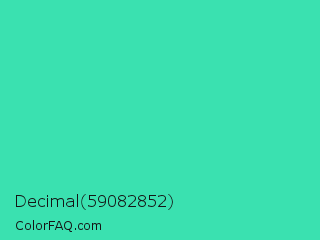 Decimal 59082852 Color is a normal green color and the nearest color is Eucalyptus #44d7a8. Hex code #3ae1b0 and RGB value is rgb(58,225,176). In RGB color space, this color is composed of 23% red, 88% green, 69% blue, In CMYK color space, this color is composed of 74% cyan, 0% magenta, 22% yellow , 12% black , In HSL color space, this color has a hue angle of 162° , 74% saturation and 55% lightness.