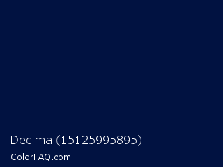 Decimal 15125995895 Color is a very dark blue color and the nearest color is Deep Cove #051040. Hex code #011241 and RGB value is rgb(1,18,65). In RGB color space, this color is composed of 0% red, 7% green, 25% blue, In CMYK color space, this color is composed of 98% cyan, 72% magenta, 0% yellow , 75% black , In HSL color space, this color has a hue angle of 224° , 97% saturation and 13% lightness.