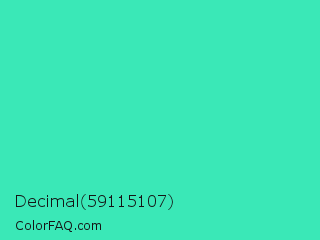 Decimal 59115107 Color is a normal green color and the nearest color is Eucalyptus #44d7a8. Hex code #3ae8b7 and RGB value is rgb(58,232,183). In RGB color space, this color is composed of 23% red, 91% green, 72% blue, In CMYK color space, this color is composed of 75% cyan, 0% magenta, 21% yellow , 9% black , In HSL color space, this color has a hue angle of 163° , 79% saturation and 57% lightness.