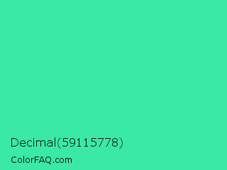Decimal 59115778 Color is a normal green color and the nearest color is Eucalyptus #44d7a8. Hex code #3ae9a6 and RGB value is rgb(58,233,166). In RGB color space, this color is composed of 23% red, 91% green, 65% blue, In CMYK color space, this color is composed of 75% cyan, 0% magenta, 29% yellow , 9% black , In HSL color space, this color has a hue angle of 157° , 80% saturation and 57% lightness.
