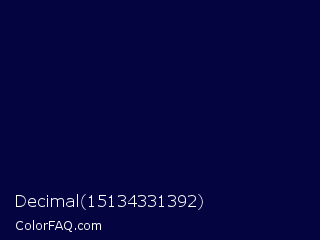 Decimal 15134331392 Color is a very dark blue color and the nearest color is Stratos #000741. Hex code #040440 and RGB value is rgb(4,4,64). In RGB color space, this color is composed of 2% red, 2% green, 25% blue, In CMYK color space, this color is composed of 94% cyan, 94% magenta, 0% yellow , 75% black , In HSL color space, this color has a hue angle of 240° , 88% saturation and 13% lightness.