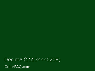 Decimal 15134446208 Color is a very dark green color and the nearest color is Dark Fern #0a480d. Hex code #044310 and RGB value is rgb(4,67,16). In RGB color space, this color is composed of 2% red, 26% green, 6% blue, In CMYK color space, this color is composed of 94% cyan, 0% magenta, 76% yellow , 74% black , In HSL color space, this color has a hue angle of 131° , 89% saturation and 14% lightness.