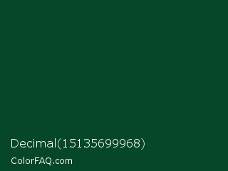 Decimal 15135699968 Color is a very dark green color and the nearest color is British Racing Green #004225. Hex code #064728 and RGB value is rgb(6,71,40). In RGB color space, this color is composed of 2% red, 28% green, 16% blue, In CMYK color space, this color is composed of 92% cyan, 0% magenta, 44% yellow , 72% black , In HSL color space, this color has a hue angle of 151° , 84% saturation and 15% lightness.