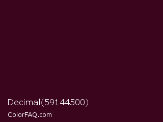 Decimal 59144500 Color is a very dark rose color and the nearest color is Toledo #3a0020. Hex code #3b051e and RGB value is rgb(59,5,30). In RGB color space, this color is composed of 23% red, 2% green, 12% blue, In CMYK color space, this color is composed of 0% cyan, 92% magenta, 49% yellow , 77% black , In HSL color space, this color has a hue angle of 332° , 84% saturation and 13% lightness.
