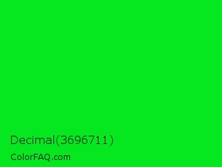 Decimal 3696711 Color is a normal green color and the nearest color is Vivid Malachite #00cc33. Hex code #05e71f and RGB value is rgb(5,231,31). In RGB color space, this color is composed of 2% red, 91% green, 12% blue, In CMYK color space, this color is composed of 98% cyan, 0% magenta, 87% yellow , 9% black , In HSL color space, this color has a hue angle of 127° , 96% saturation and 46% lightness.