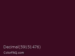 Decimal 59151476 Color is a very dark rose color and the nearest color is Toledo #3a0020. Hex code #3b0b22 and RGB value is rgb(59,11,34). In RGB color space, this color is composed of 23% red, 4% green, 13% blue, In CMYK color space, this color is composed of 0% cyan, 81% magenta, 42% yellow , 77% black , In HSL color space, this color has a hue angle of 331° , 69% saturation and 14% lightness.