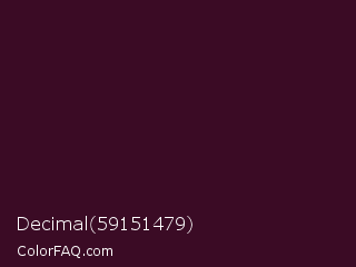 Decimal 59151479 Color is a very dark rose color and the nearest color is Toledo #3a0020. Hex code #3b0b25 and RGB value is rgb(59,11,37). In RGB color space, this color is composed of 23% red, 4% green, 15% blue, In CMYK color space, this color is composed of 0% cyan, 81% magenta, 37% yellow , 77% black , In HSL color space, this color has a hue angle of 328° , 69% saturation and 14% lightness.